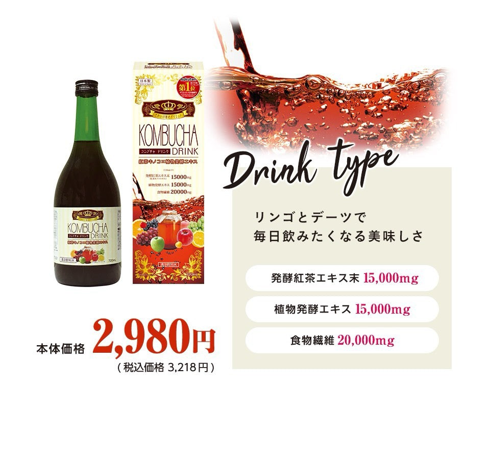 High fructose corn syrup (Japanese production), apple concentrated fruit juice, indigestible dextrin, dates concentrated fruit juice, fermented plant extract (molasses, brown sugar, mugwort, turmeric, houttuynia cordata, lotus leaf, ginseng, andrographis paniculata, hypericum, sasa veitchii, dandelion root, ganoderma lucidum, etc), dextrin, fermented tea extract powder / acidulant, fragrance, thickener (xanthan gum), preservative (sodium benzoate), (some apples included)